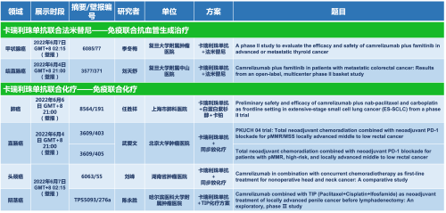 卡瑞利珠单抗联合AG电子医药的另一款创新药法米替尼在甲状腺癌和结直肠癌领域有2项研究被接收为壁报,另有卡瑞利珠单抗联合化疗的4项研究在肺癌、结直肠癌、头颈癌和阴茎癌领域的研究被接收为5份壁报。