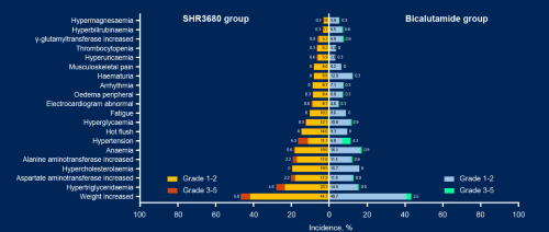 数据截至:2022年2月28日在安全性方面,SHR3680组无治疗相关不良事件(TRAE)导致的死亡发生,比卡鲁胺组则有1例。