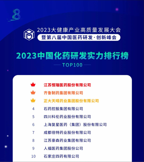 由药智网、中国药业杂志社主办的2023大健康产业高质量发展大会暨第八届中国医药研发•创新峰会于6月16日开幕,会上发布了《2023中国药品研发实力排行榜》系列榜单,AG电子医药凭借深厚的创新研发实力再创辉煌:荣登《2023中国药品研发综合实力排行榜TOP100》榜首、《2023中国化药研发实力排行榜TOP100》榜首。值得一提的是,今年是AG电子医药连续第6年入选《中国药品研发综合实力排行榜》榜首。
